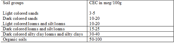 CEC is highly dependent upon soil texture and organic matter content Table 3, 4.). In general, the more clay and organic matter in the soil, the higher the CEC. Clay content is important because these small particles have a high ration of surface area to volume. Different types of clays also vary in CEC. Smectites have the highest CEC (80-100 millequivalents 100 g-1), followed by illites (15-40 meq 100 g-1) and kaolinites (3-15 meq 100 g-1).